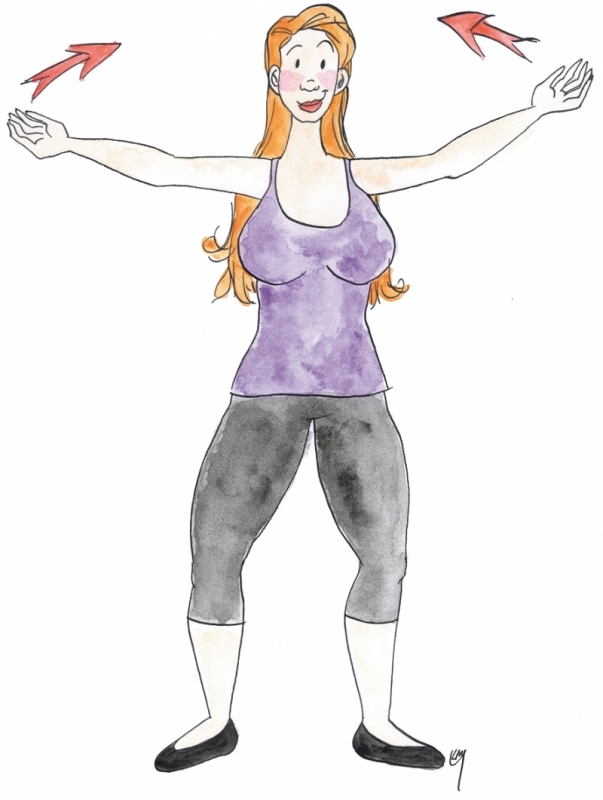 Debout, décalez les pieds. Placez les bras en croix. Dirigez les paumes des mains vers l’avant. Tout en respirant régulièrement, essayez d’amener les bras le plus loin possible vers l’arrière.