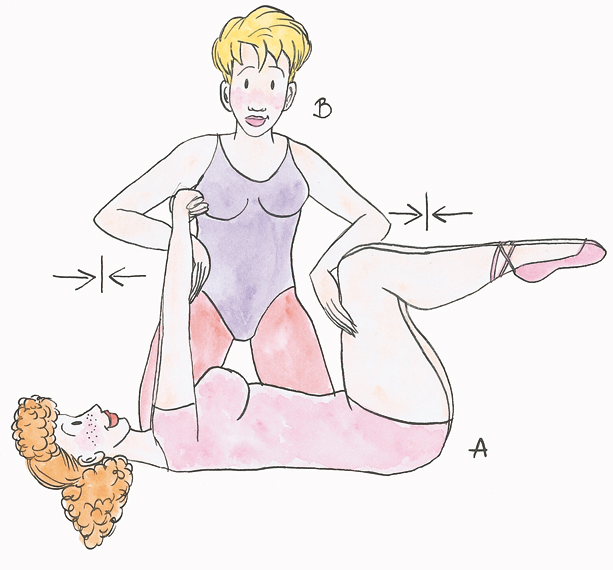 La personne A est au sol sur le dos. Ses bras sont tendus verticalement et ses doigts sont croisés. Ses jambes sont fléchies de telle sorte que ses cuisses soient proches de sa poitrine. La personne B est à genoux sur le côté. Elle place une main en appui contre les genoux de sa partenaire et l’autre en appui contre ses mains. La personne A essaie de rapprocher ses mains de ses genoux en soulevant simultanément ses épaules et ses fessiers. Sa partenaire empêche ce mouvement en exerçant une résistance.