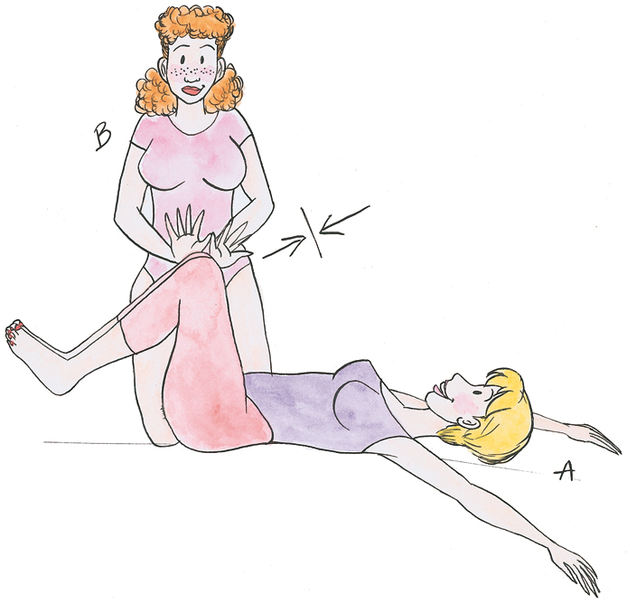 La personne A est allongée sur le dos. Elle a les jambes fléchies, les pieds en l’air et les cuisses à la verticale. La personne B se place sur les genoux à droite de la personne A. La personne B pose ses mains contre le genou droit de la personne A. La personne A essaie d’amener ses genoux du côté droit. La personne B l’en empêche en résistant avec ses bras.